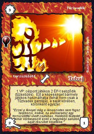 Kiadás: Alappakli, 5. kiadás (Ősök városa), Alappakli, 6. kiadás (Ősök Városa), Alappakli, 7. kiadás (Ősök Városa) Gyakoriság: gyakori Lapszín (isten): Tolvaj Klán Típus: torzszülött Szöveg: 1 VP: célpont játékos 2 ÉP-t sebződik (tűzsebzés). Ezt a képességet bármely játékos használhatja (tehát nem csak a Tűzivadék gazdája), a saját körében, körönként egyszer. Szinesítő szöveg: "Ezzel a lénnyel még a lárvaszinten sem fogsz találkozni, kivéve, ha alulmaradsz egy torzszülöttel vívott csatában. Haldokló testedet hamar körbeveszik ezek a hegymélyi sakálok, saját részüket követelve." Illusztráció: Váradi János