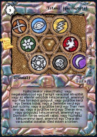 Kiadás: Ősi legendák Gyakoriság: ultra ritka Lapszín (isten): Bufa Típus: azonnali Szöveg: Kijátszásakor választhatsz: vagy megakadályozod egy Fairlight varázslat létrejöttét, vagy az ellenfél sebződik kétszerannyit, amennyit egy Raia forrásból gyógyult, vagy gyűjtőbe kerül egy Elenios bűbáj, vagy a Semmibe kerül egy Leah szörny, vagy a gyűjtőbe kerül egy Tharr nem lény lap, vagy a gyűjtőbe kerül egy Sheran lény, vagy gyógyulsz kétszerannyit, amennyit egy Dornodon forrás sebzett rajtad, vagy húzhatsz kétszerannyi lapot, amennyit egy Chara-din varázslattal dobattak tőled ebben a körben. Illusztráció: Lipták László